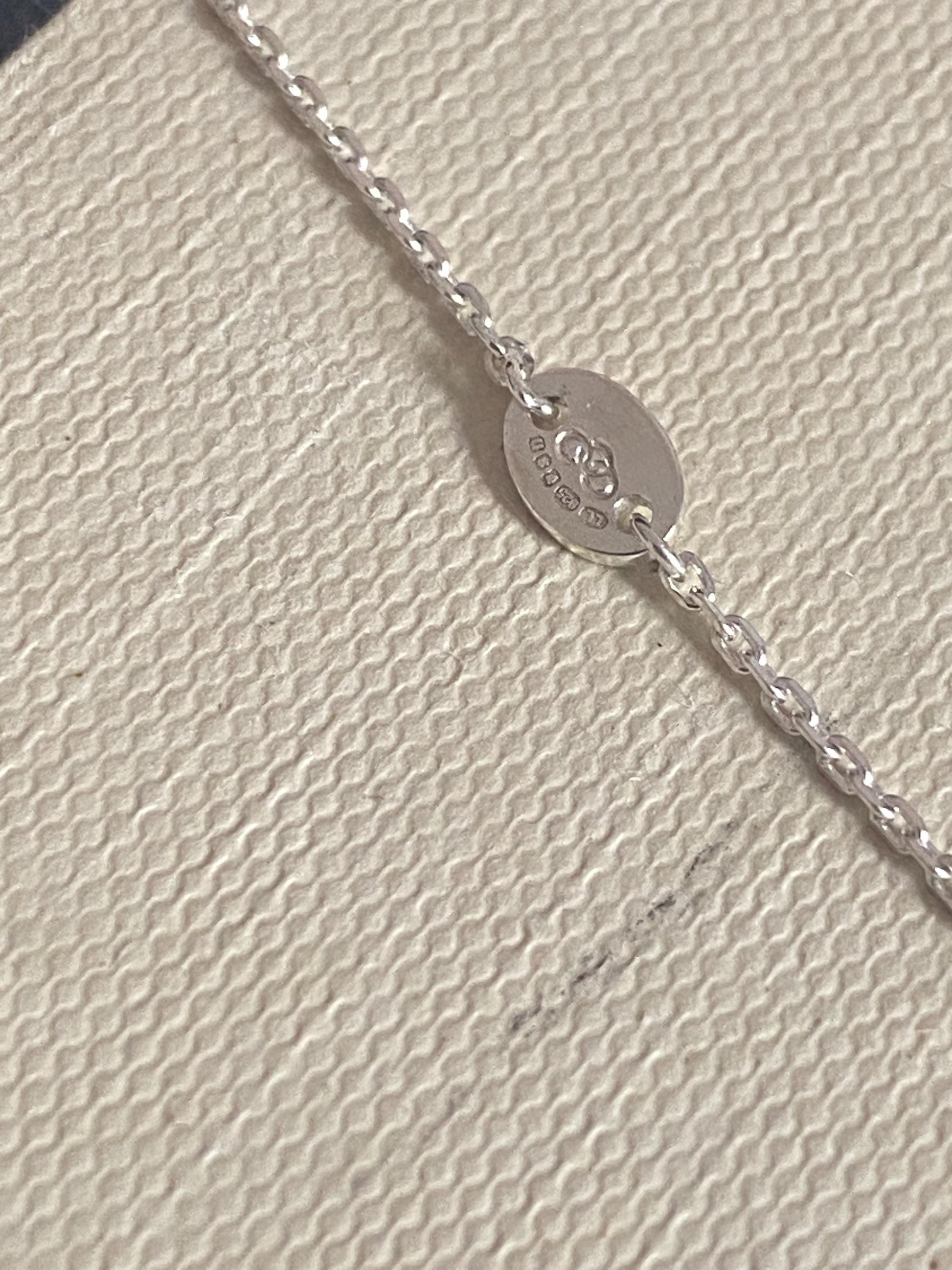 The is a little silver tag along the diamond cut chain that bears the Links of London logo and hallmark on one side and s925 on the other.