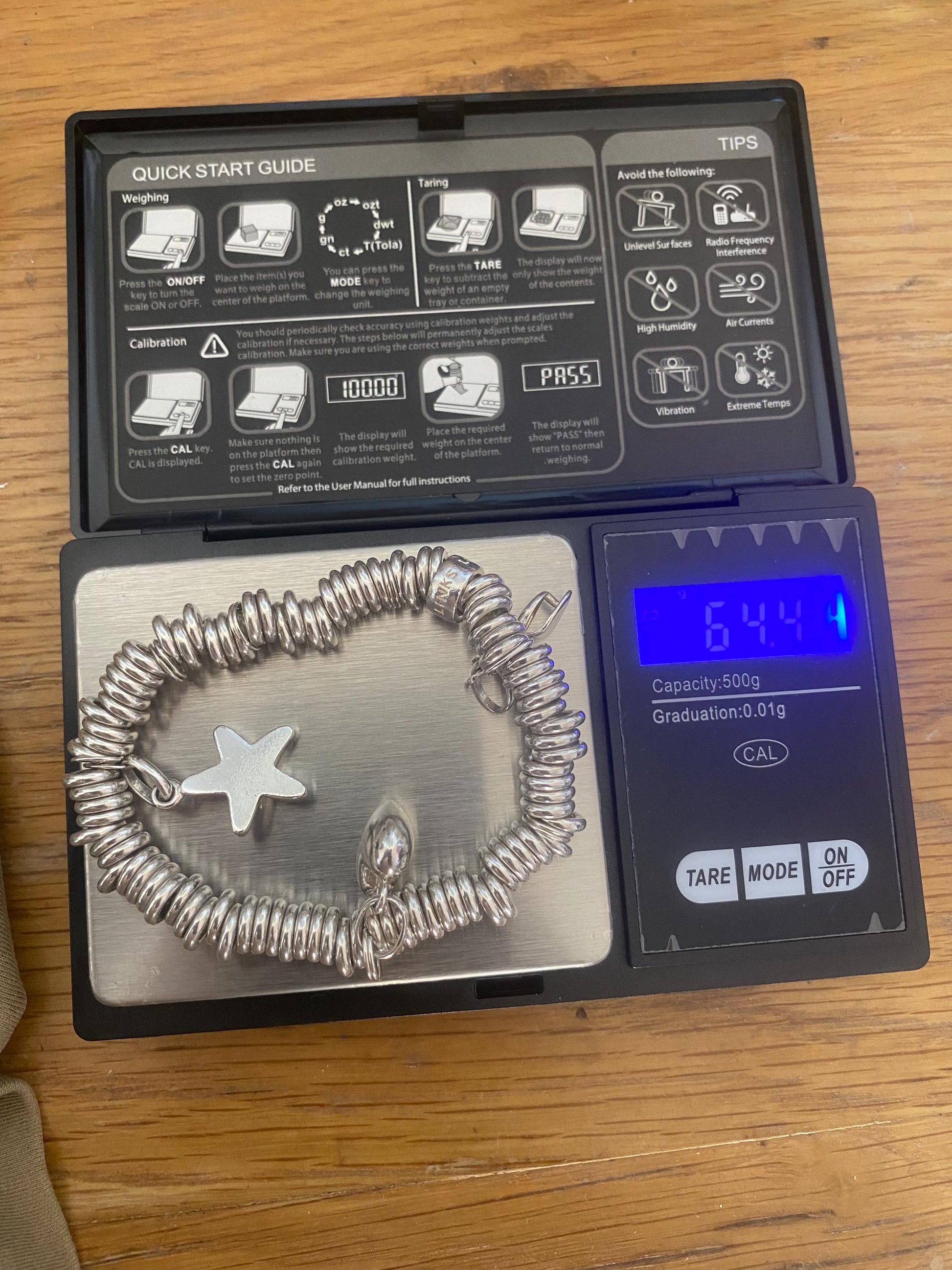 The diameter of the bracelet is approx 2 inches and it weighs 64.4 grams