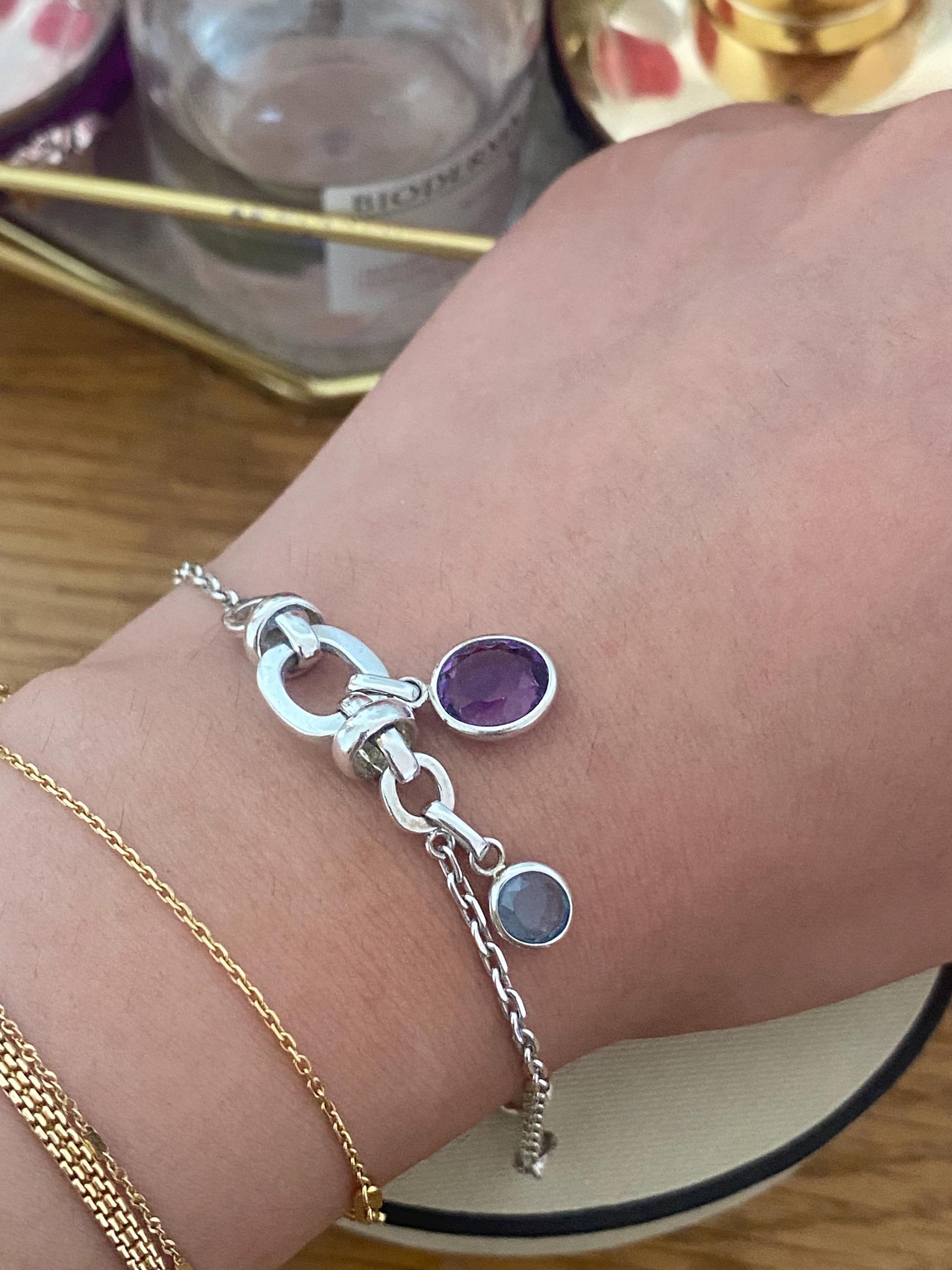 Rare vintage Genuine LINKS OF LONDON Hallmarked Silver anethyst and sapphire drop gem Bracelet With Box